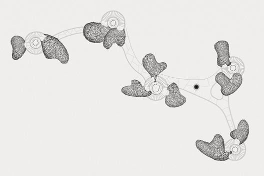 1:100 Plan, Utopian Studio concept of levitated pods circulating aerial walkway between trees.