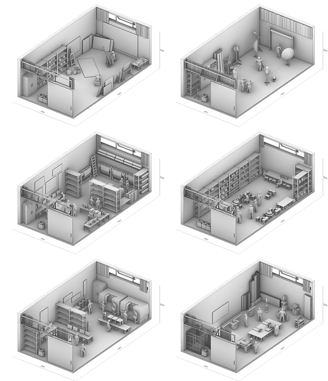 The hub reference units, showing the possible arrangements of the studio spaces based on the